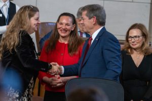 Gov. Jim Pillen, right, shakes hands with State Sen. Wendy DeBoer of Omaha as State Sen. Danielle Conrad of Lincoln smiles at the pair. First Lady Suzanne Pillen looks from the right. Jan. 15, 2025. (Zach Wendling/Nebraska Examiner)