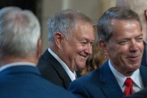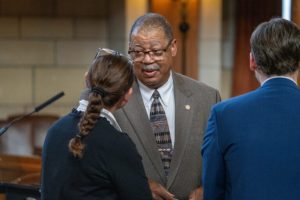 State Sen. Terrell McKinney of Omaha, center, greets Gov. Jim Pillen ahead of the governor’s annual State of the State Address to the Legislature. Jan. 15, 2025. (Zach Wendling/Nebraska Examiner)
