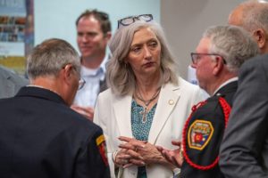 State Sen. Tanya Storer of Whitman, center, meets with state and local officials for an update on the disaster response to a major fire in her north-central legislative district. April 23, 2025. (Zach Wendling/Nebraska Examiner)