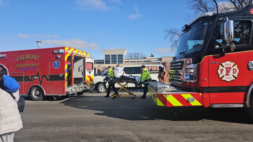 Rescue personnel take a Fremont student to the hospital after she was struck by a vehicle displaying a Trump flag during a student-led, non-school demonstration in front of the high school. The vehicle fled. (Courtesy of Veronica Sandoval/News Channel Nebraska)