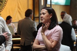 Denise Powell talking to people at a mixer in Omaha on April. 11, 2026. (Juan Salinas II/Nebraska Examiner)