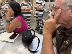 El alguacil Jerome Kramer, a la derecha, y la senadora estatal Margo Juarez escuchan a detenidos de ICE en la Cárcel del Condado de Lincoln en North Platte. (Cindy Gonzalez/Nebraska Examiner)
