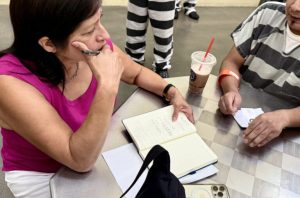 La senadora estatal Margo Juarez de South Omaha visita a trabajadores de Glenn Valley Foods detenidos durante una redada migratoria del 10 de junio en Omaha y recluidos en la Cárcel del Condado de Lincoln en North Platte. (Cindy Gonzalez/Nebraska Examiner)