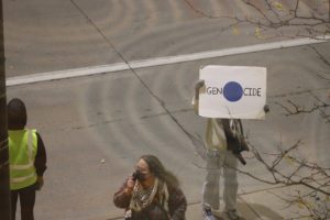 Un manifestante afuera del evento del Partido Demócrata de Nebraska en el hotel Omaha Hilton, el 8 de noviembre de 2025. (Juan Salinas II/Nebraska Examiner)