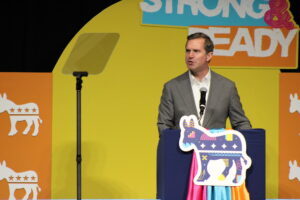 El gobernador de Kentucky, Andy Beshear, habla durante una recaudación de fondos del Partido Demócrata de Nebraska en el hotel Omaha Hilton el 8 de noviembre de 2025. (Juan Salinas II/Nebraska Examiner)