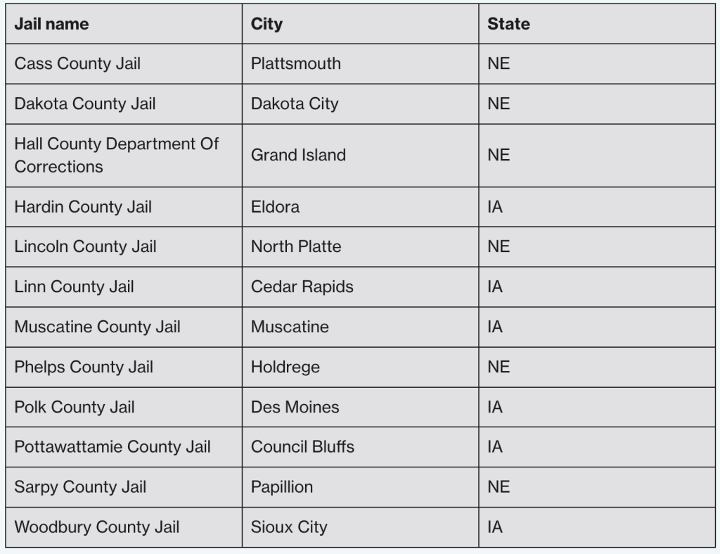 La mayoría de las cárceles que han aceptado retener reclusos de ICE están en o cerca de centros regionales como Des Moines, Sioux City y Omaha. Algunos condados urbanos, incluido el condado de Douglas, han rechazado mantener detenidas a personas para ICE.