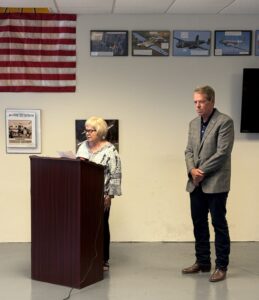 La alcaldesa de McCook, Linda Taylor, habla durante una conferencia de prensa previa junto al gobernador de Nebraska, Jim Pillen, en el Aeropuerto Regional Ben Nelson de McCook, el martes. (Brigham Larington/McCook Gazette)