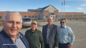 Cuatro de los cinco legisladores de Nebraska posan para una fotografía antes de su recorrido por el centro de detención del ICE en McCook el lunes. Aparecen los senadores estatales Rob Clements, de Elmwood; Tom Brandt, de Plymouth; Myron Dorn, de Adams; y Dan Lonowski, de Hastings. (Cortesía del senador estatal Rob Clements)