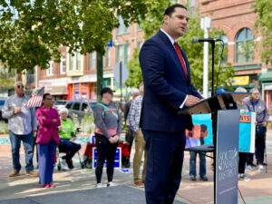 Heath Mello, presidente y director ejecutivo de la Greater Omaha Chamber, habla durante un evento en el que se presentó una actualización sobre la renovación planificada de la Plaza de la Raza en el sur de Omaha. (Cindy Gonzalez/Nebraska Examiner)