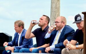 El gobernador Jim Pillen durante un acto inaugural en junio de 2025 que marcó el inicio de una planta procesadora de leche de 186 millones de dólares en el condado de Seward. El grupo prueba un producto de Dari Processing, Moo’v, que se procesará en el campus, el cual Pillen calificó como “un gran avance para Seward, el estado de Nebraska y cada empresa agrícola familiar”. (Cindy Gonzalez/Nebraska Examiner)