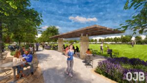 Representación del futuro complejo Project Health de UNMC, una estructura de vidrio conectada por pasarelas peatonales a un estacionamiento proyectado y al edificio CORE, actualmente en construcción al oeste de Saddle Creek Road, en el denominado Edge District. (Cortesía del University of Nebraska Medical Center)