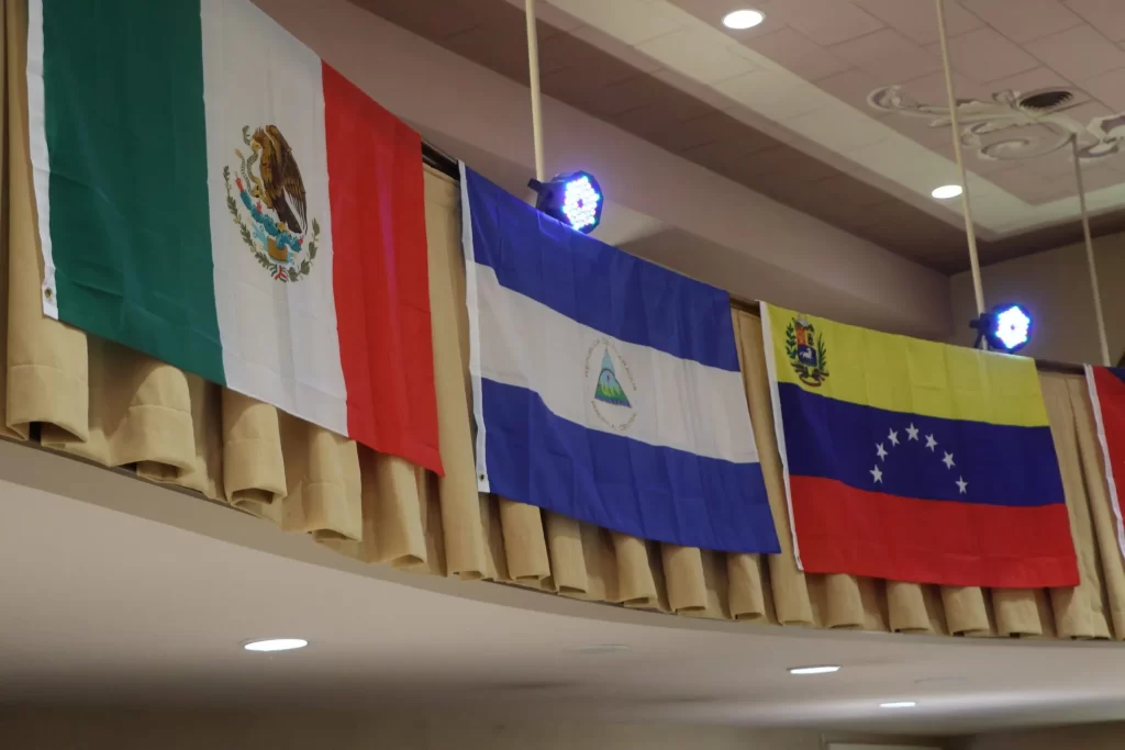 Banderas de distintos países decoran el balcón superior de la First United Methodist Church en Lexington. En dos años, la asistencia al servicio en español de la iglesia creció a 65 personas. Foto: Brian Neben, Flatwater Free Press