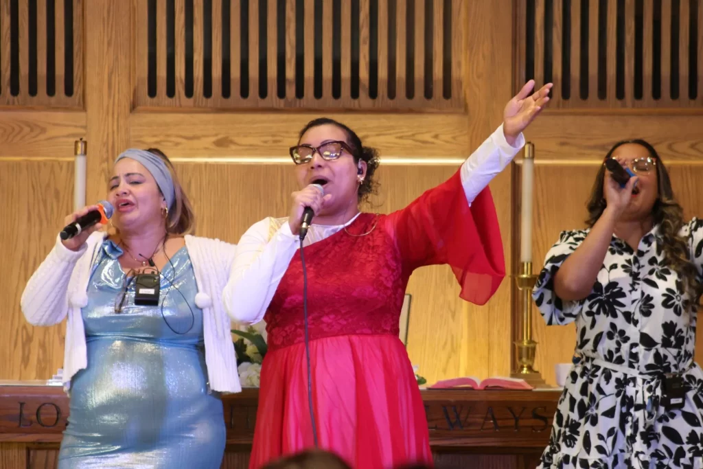 Mujeres lideran el canto durante el servicio en español de la First United Methodist Church en Lexington. Desde el anuncio del cierre de Tyson, alrededor de 30 personas ya han dejado la congregación, dijeron los pastores. Foto: Brian Neben, Flatwater Free Press