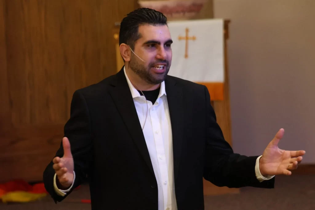 Horas después de que Armijo terminara su sermón del domingo por la mañana, el pastor Javier Aguila caminaba de un lado a otro en el mismo escenario y predicaba un mensaje similar ante un público distinto y en otro idioma, durante el servicio en español.