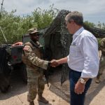 El gobernador Jim Pillen durante una visita a la frontera entre Texas y México. Conversa con integrantes de la Guardia Nacional de Nebraska, a quienes desplegó para ayudar a Texas a vigilar su frontera. (Cortesía de la Oficina del Gobernador de Nebraska)