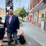 El senador estatal Dunixi Guereca, en 2025, sobre la South 24th Street de su distrito en South Omaha, junto a la empresaria Martha Barrera. (Cindy Gonzalez/Nebraska Examiner)