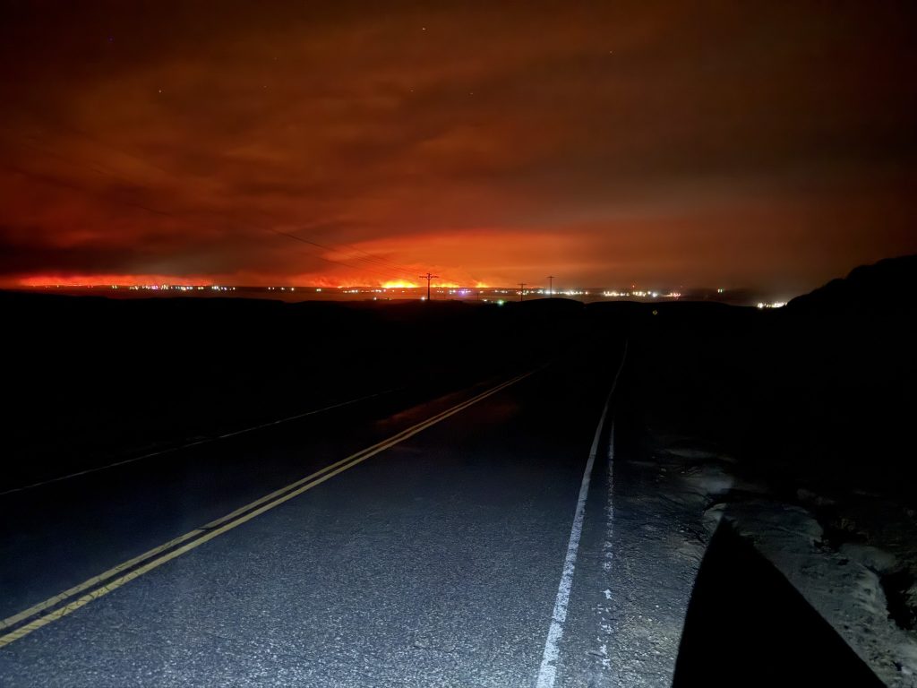 Un incendio corona una colina y se acerca a viviendas en el lado norte de Lake McConaughy el jueves por la noche, justo al oeste de la presa de Lake McConaughy, en una vista hacia el norte. (Cortesía de Jake Wyatt/Nebraska Rural Radio Association)