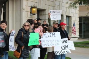 Manifestantes frente al Tribunal de Distrito del condado de Red Willow en McCook, Nebraska. 24 de octubre de 2025. (Juan Salinas II/Nebraska Examiner)