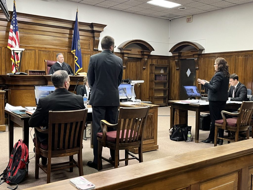 El juez del Tribunal de Distrito del condado de Red Willow, Patrick Heng, escucha los argumentos de los abogados Nick Grandgenett, a la izquierda, y Jennifer Huxoll, a la derecha, sobre la legalidad de convertir el Work Ethic Camp estatal en McCook, Nebraska, en un centro de detención migratoria. 24 de octubre de 2025. (Erin Bamer/Nebraska Examiner)