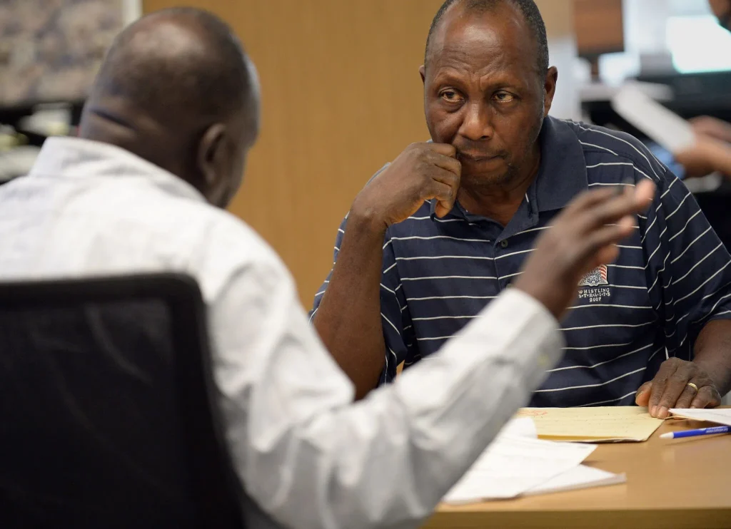 Al otro lado de la sala, Deng recibió a Frank Pittman, un liberiano que llegó a Estados Unidos como refugiado en 2004. Ahora, ya ciudadano naturalizado, pidió una cita con CSS con la esperanza de presentar una petición para traer también a su nueva esposa y a los hijos de ella a Estados Unidos.