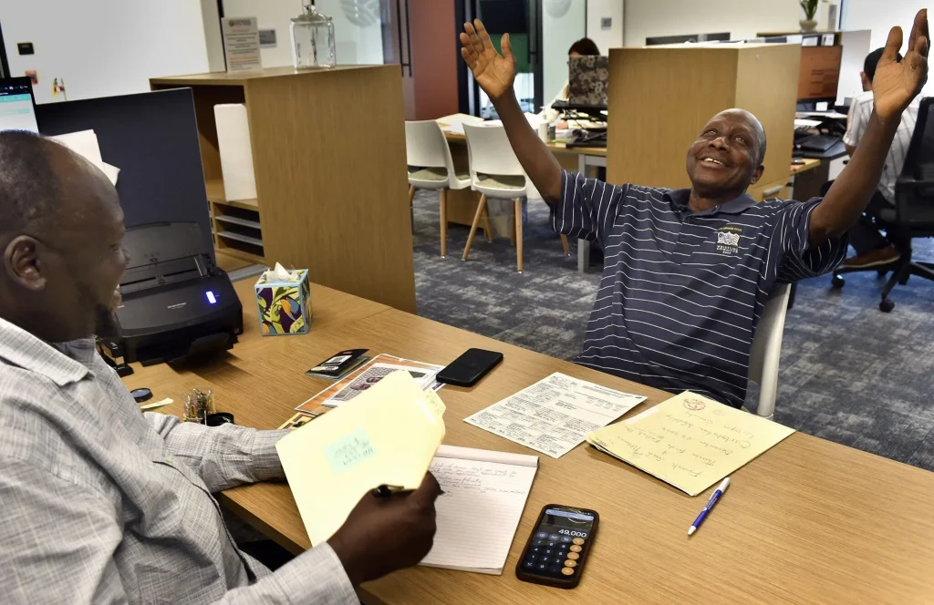 El cliente Frank Pittman (derecha) reacciona con alegría después de que le informaran que cumple con el nivel de ingresos exigido por el gobierno federal para traer a su esposa a Estados Unidos. Se estaba reuniendo con el especialista en inmigración Sebit Deng en Catholic Social Services of Southern Nebraska. Foto de Eric Gregory para Flatwater Free Press