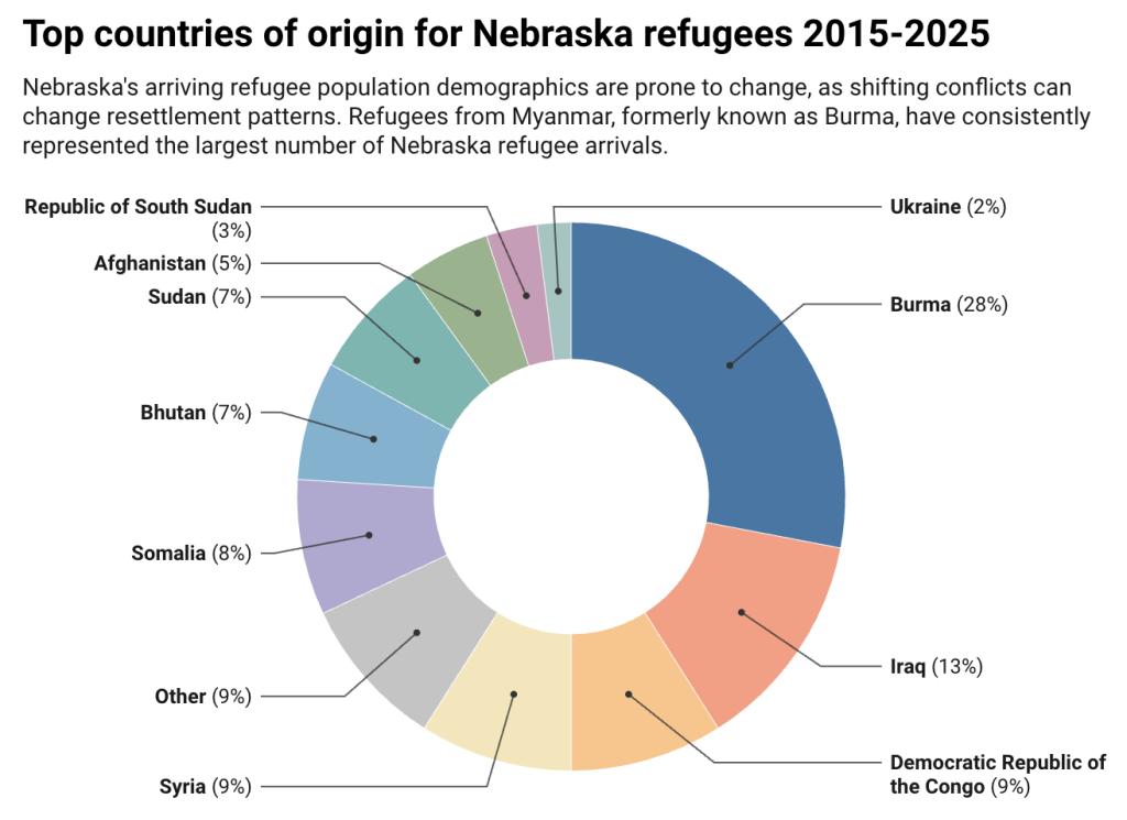 La composición demográfica de la población refugiada que llega a Nebraska tiende a cambiar, ya que los conflictos cambiantes modifican los patrones de reasentamiento. Los refugiados de Myanmar, antes conocido como Birmania, han representado de manera constante el mayor número de llegadas de refugiados a Nebraska.